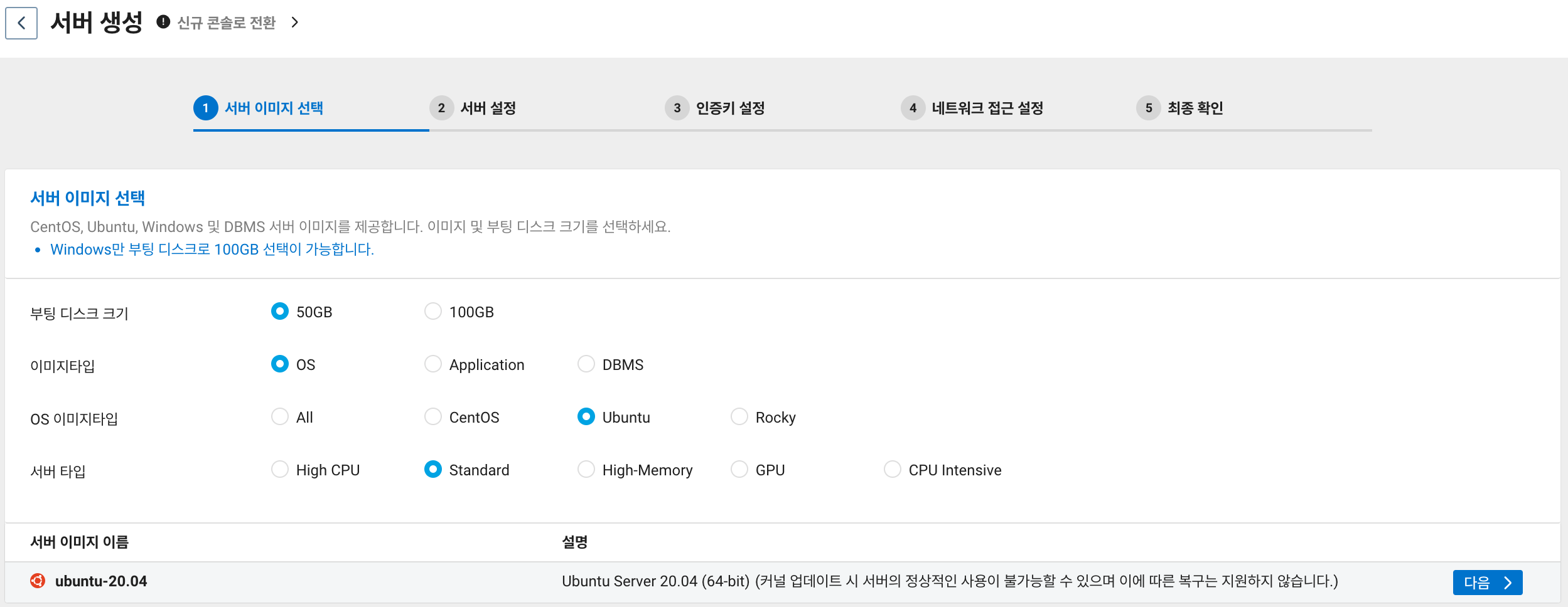 OS는 우분투만 써봤기에 우분투만 체크하고, 서버 타입은 스탠다드로 설정해주었다.