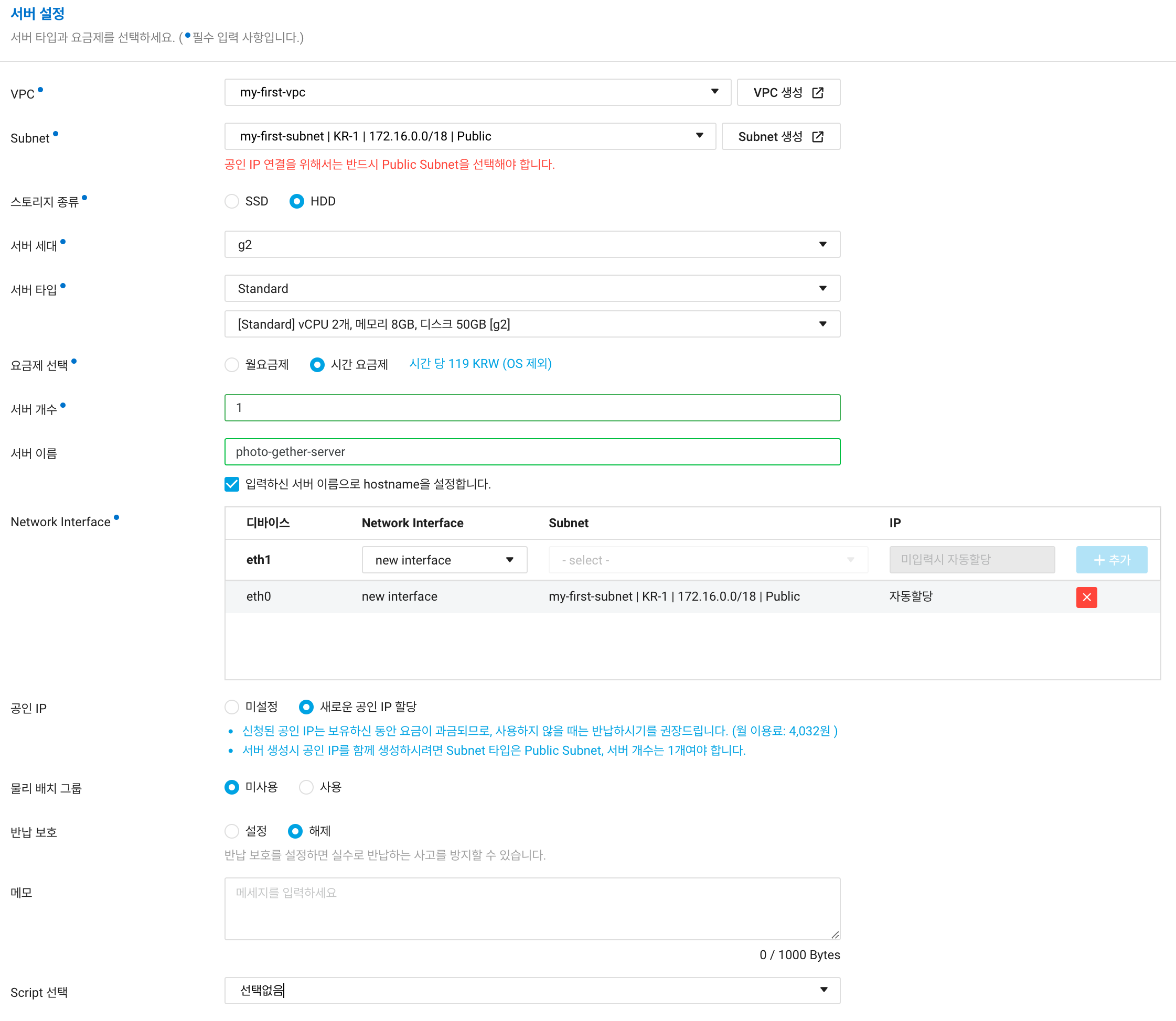 설정할 게 많아 보이는데, 우선 VPC와 서브넷을 좀 전에 만들어주었던걸 연결해주고 스토리지는 값이 싼 HDD로 변경 서버 세대는 2세대로 하고 서버 타입은 스탠다드 중 가장 구린걸로 설정했다. 그리고 중요한 요금제는 사용한만큼만 부가되는 시간 요금제로 설정했다. 서버 이름은 서비스명에 맞게 해두었다. 네트워크 인터페이스는 이 서버의 사설 IP를 설정하는 것 같은데 원하는 IP가 따로 없으니 자동할당으로 추가해주었다. 그리고 외부에서 접속해야하니 공인 IP를 설정해주었다. 물리 배치 그룹은 잘 모르겠으니 일단 미사용으로 설정해주었다.