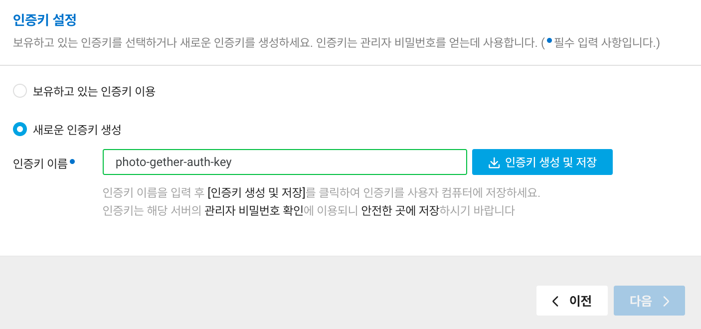 그리고 인증키를 설정하는 화면이 나타나는데, 처음이니까 새로운 인증키를 발급받는다.