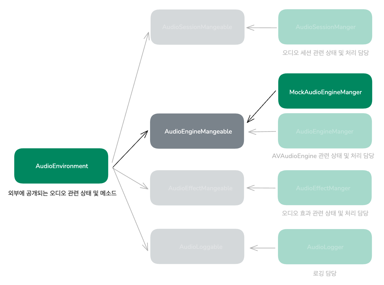 인터페이스를 분리하고 해당 객체를 Mocking함으로써 다음과 같은 구성의 AudioEngine을 만들 수 있었습니다
