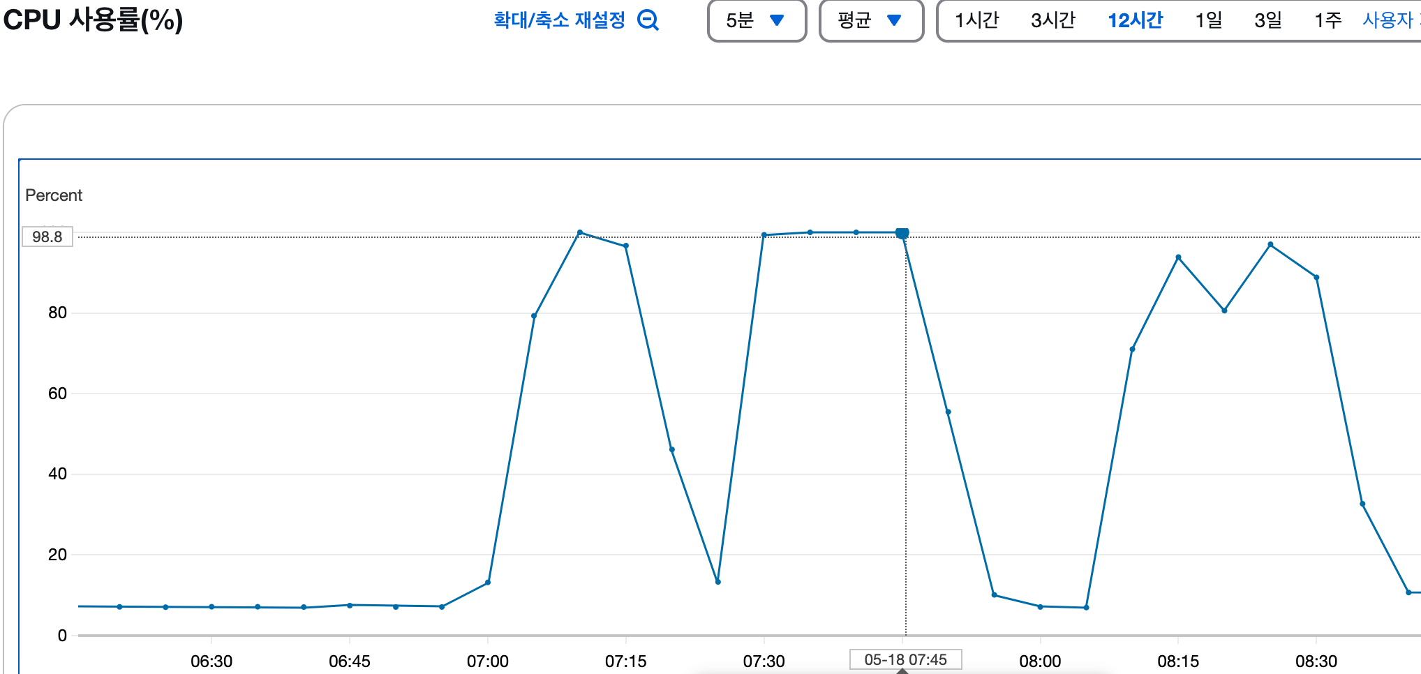 서버를 실행했을 때 반응이 없어 AWS 대시보드에서 확인해보니, CPU 사용량이 100%에 가까운 상태로 장시간 유지됨을 확인할 수 있었습니다.