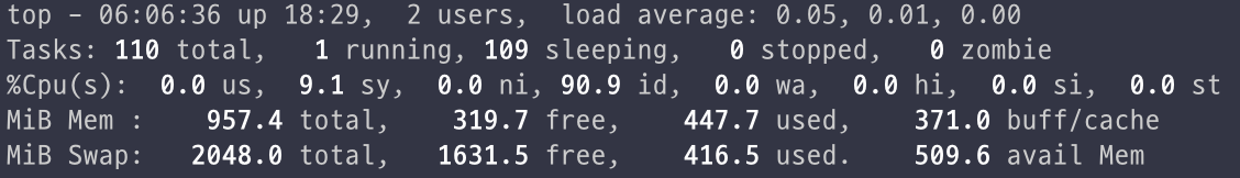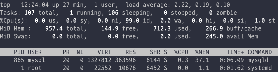 또한 인스턴스에 접속해 top 명령어로 리소스 사용량을 확인한 결과, DB 서버(mysqld)가 메모리의 40% 이상을 점유하고 있는 상황으로 가용 메모리가 약 150MB 밖에 되지 않는 상황이었습니다.