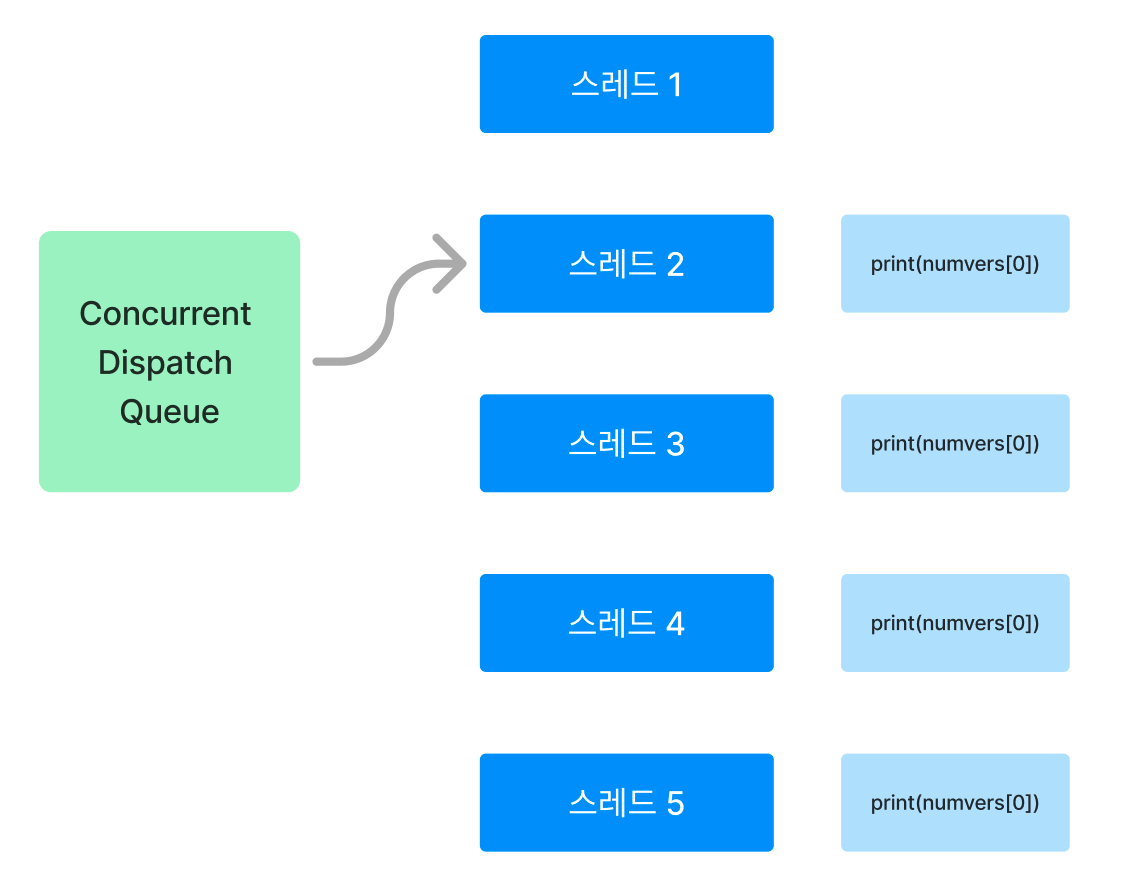 😨 메인스레드 데드락 주의! 메인 스레드에서 sync로 호출하면, 메인 스레드는 작업결과를 리턴받을 때까지 기다리게되고(block) 메인 스레드는 기다리느라 아무것도 할 수 없으므로 작업을 수행할 수 없습니다. 따라서, 작업은 “메인스레드야, 내 작업 해줘!” 외치고 있고, 메인스레드는 “작업결과 나올때까지 기다릴게.” 하고 있는 데드락 상태에 빠지게 됩니다. ```swift var numbers = [0, 1, 2, 3, 4] let dispatchQueue = DispatchQueue(label: “custom”)