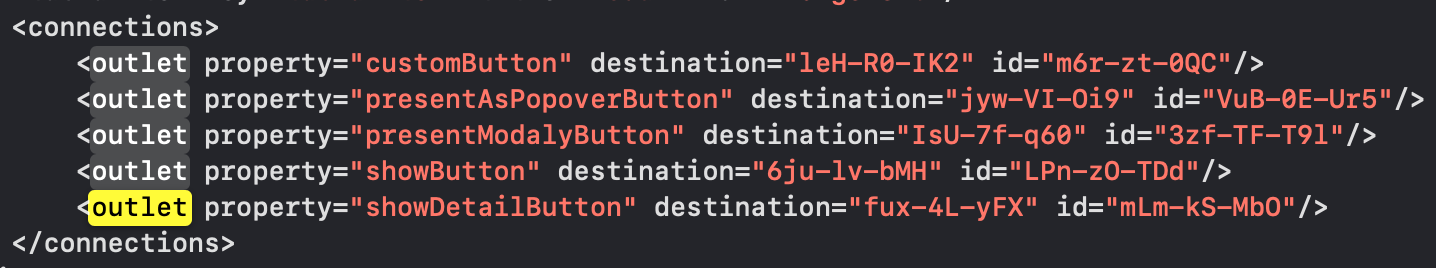 스토리보드에서 outlet을 검색해보면 connections 안에 연결 정보가 저장되어 있음을 알 수 있습니다.