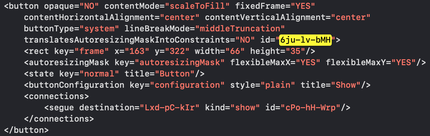 showButton과 연결된 스토리보드의 객체를 가리키고 있네요! id 는 해당 outlet 연결정보의 고유 id 였습니다.