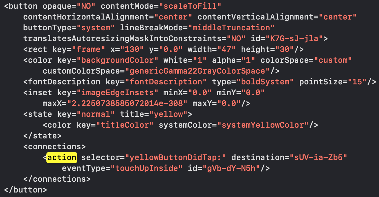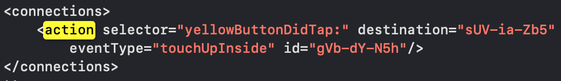 IBOutlet 과 IBAction 모두 스토리보드에 고유한 id를 가진 연결정보로서 기록되어 있고, destination, selector 등을 통해 실행할 메소드나 (연결된 변수 - 스토리보드 객체)를 찾아갈 수 있도록 해주고 있었네요!