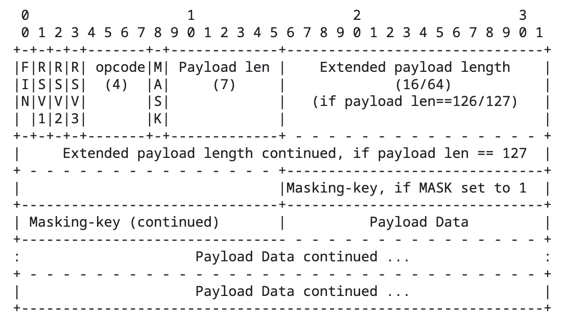 | Masking key | 실제 데이터의 XOR 마스킹 키 (클라이언트 → 서버일 때만 존재) |