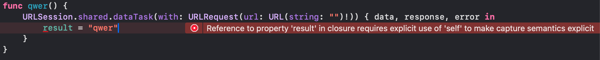 Swift에서의 이스케이핑 클로저에서 self에 접근하려고 하면 명시적으로 self를 선언하라는 컴파일 에러가 아래와 같이 발생합니다.