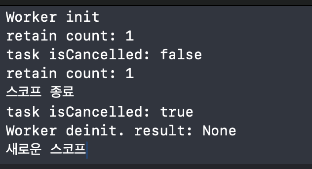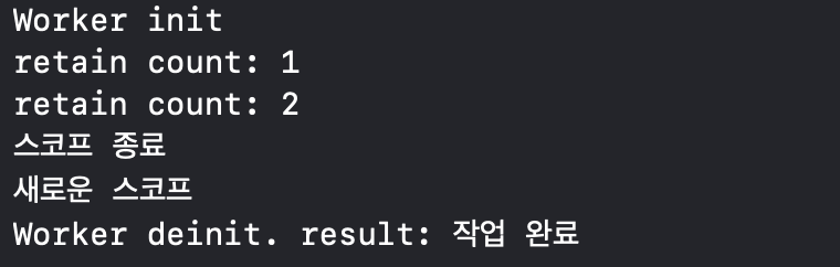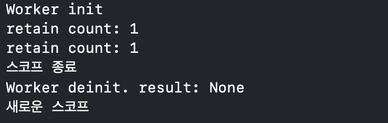 재밌는 결과입니다. 스코프를 벗어나자마자 worker 인스턴스는 릴리즈되었고 스코프 종료 -> deinit -> 새로운 스코프 순으로 진행되었습니다.