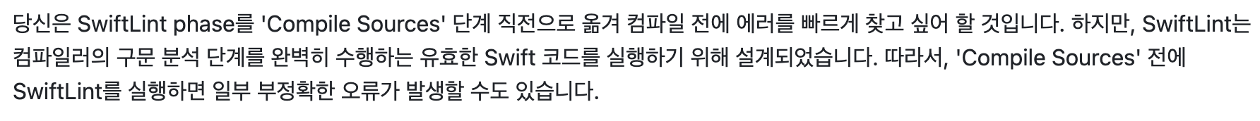 컴파일 소스 페이즈 뒤에 위치시킨 건 아래 내용을 의식해 옮겨주었습니다. 기존 프로젝트에선 컴파일 소스 페이즈 전에 린트를 실행시켜주었는데, 일단 문서대로 가이드하겠습니다.