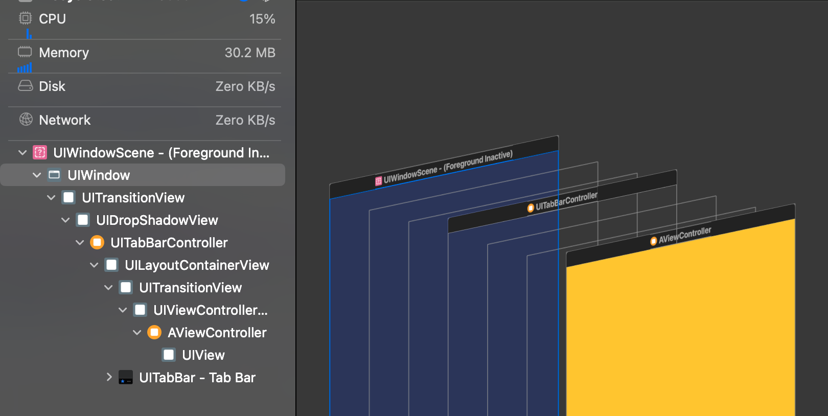 먼저 iOS 17.4로 빌드한 화면의 hierarchy를 확인해보겠습니다. 최상위에 UIScene이 아닌 UIWindowScene이 있네요. 이게 무슨일일까요?
