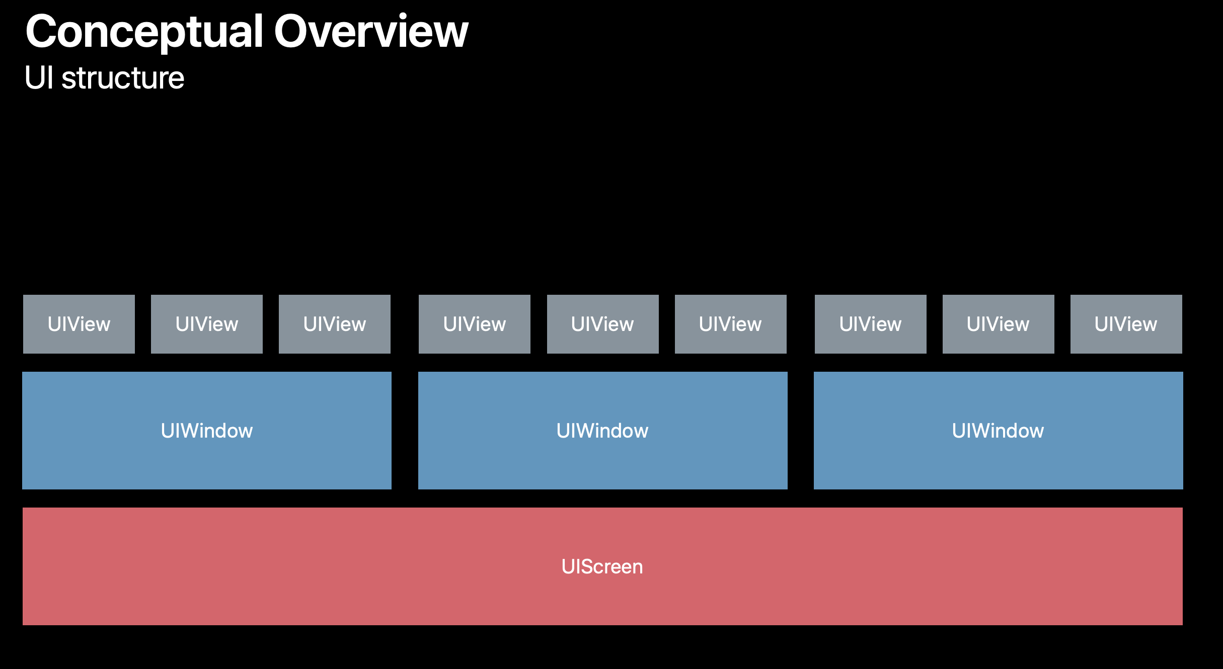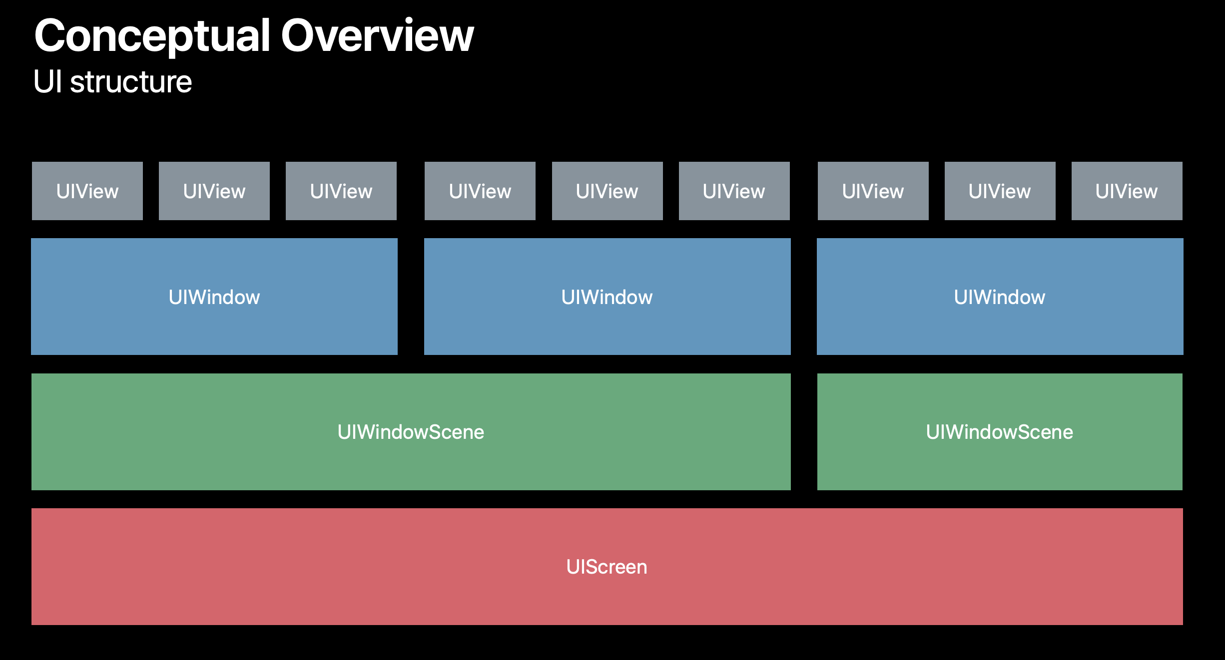 멀티 윈도우의 개념을 잘 짚고 넘어가야 하는데, 여기서 말하는 멀티윈도우란 iOS13 이후 등장한 iPadOS 의 Split View 나 Slide Over를 통해 같은 앱의 여러 window를 띄울 수 있음을 설명한 것 이고, iOS12 이전에 UIWindow를 여러개 띄우는 건 하나의 UIScreen 위에 키보드나 알림창 같은 윈도우를 오버레이할 순 있었지만, 같은 앱의 여러 윈도우를 띄울 순 없었습니다.