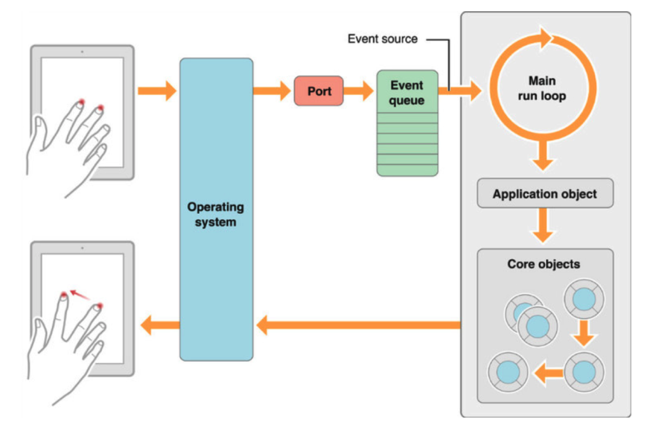 터치와 같은 유저이벤트가 발생하면 이벤트(시스템 영역)를 생성, 시스템에 들어오는 이벤트들은 포트를 거쳐 Event Queue라는 대기열에 쌓이게 되고, 런루프는 실행이 될 때 여기에 있는 이벤트들을 가져와 처리하게 됩니다. (루프라고 해서 자체적으로 무한 루프처럼 동작할 것 같지만 그렇지 않음)