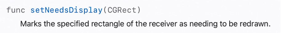 이 메소드는 호출한 뷰의 디스플레이를 그리는 메소드입니다. 서브뷰들에 연쇄적으로 호출되던 layoutSubviews와 다르게 이 메소드는 호출한 뷰의 디스플레이만 다시 그립니다. 이 메소드 또한 시스템이 호출해주는 메소드이므로 외부에서 호출하지 않습니다. 대신 아래에서 소개하는 메소드들을 통해 간접적으로 호출할 수 있습니다.