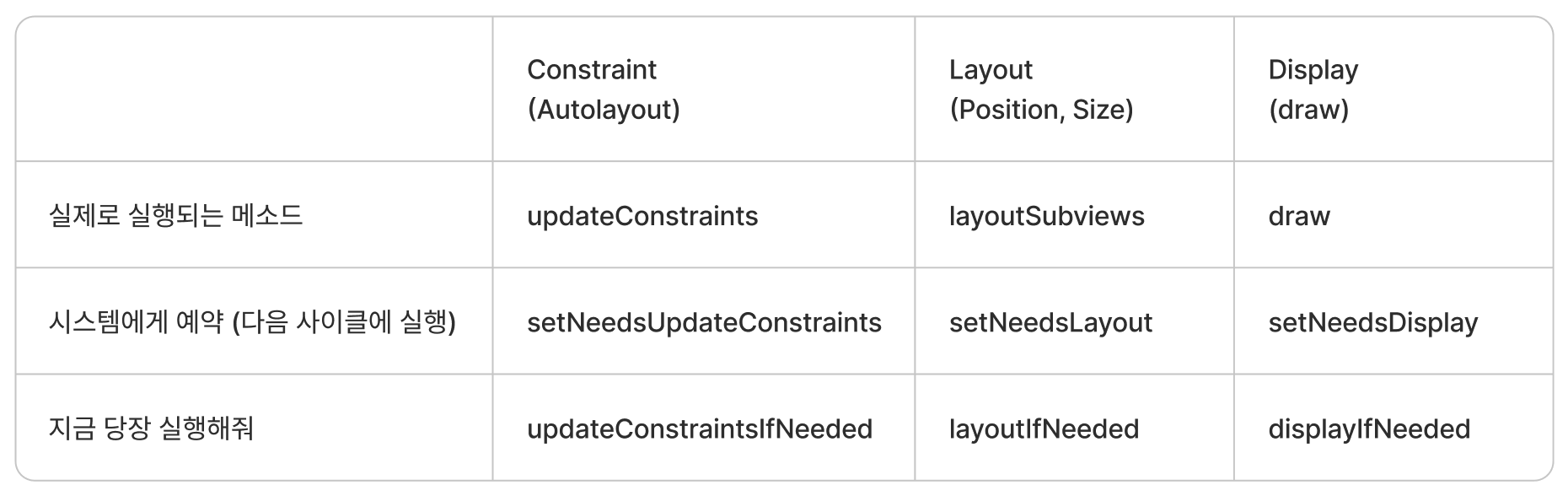 UIView와 하위 모든 서브뷰들에 대한 위치와 크기의 변경을 처리하는 메소드. 제약 조건을 통해 각 뷰들의 레이아웃을 계산한다. 이 메소드는 해당 뷰와 모든 하위뷰에 대해 적용되기 때문에 비용이 비싼 메소드입니다. 그렇기에 애플에선 오버라이딩하는 것 이외에 외부에서 호출하지 말라고 하고 있습니다. 대신 아래에서 소개할 메소드들을 통해 간접적으로 호출할 수 있습니다.