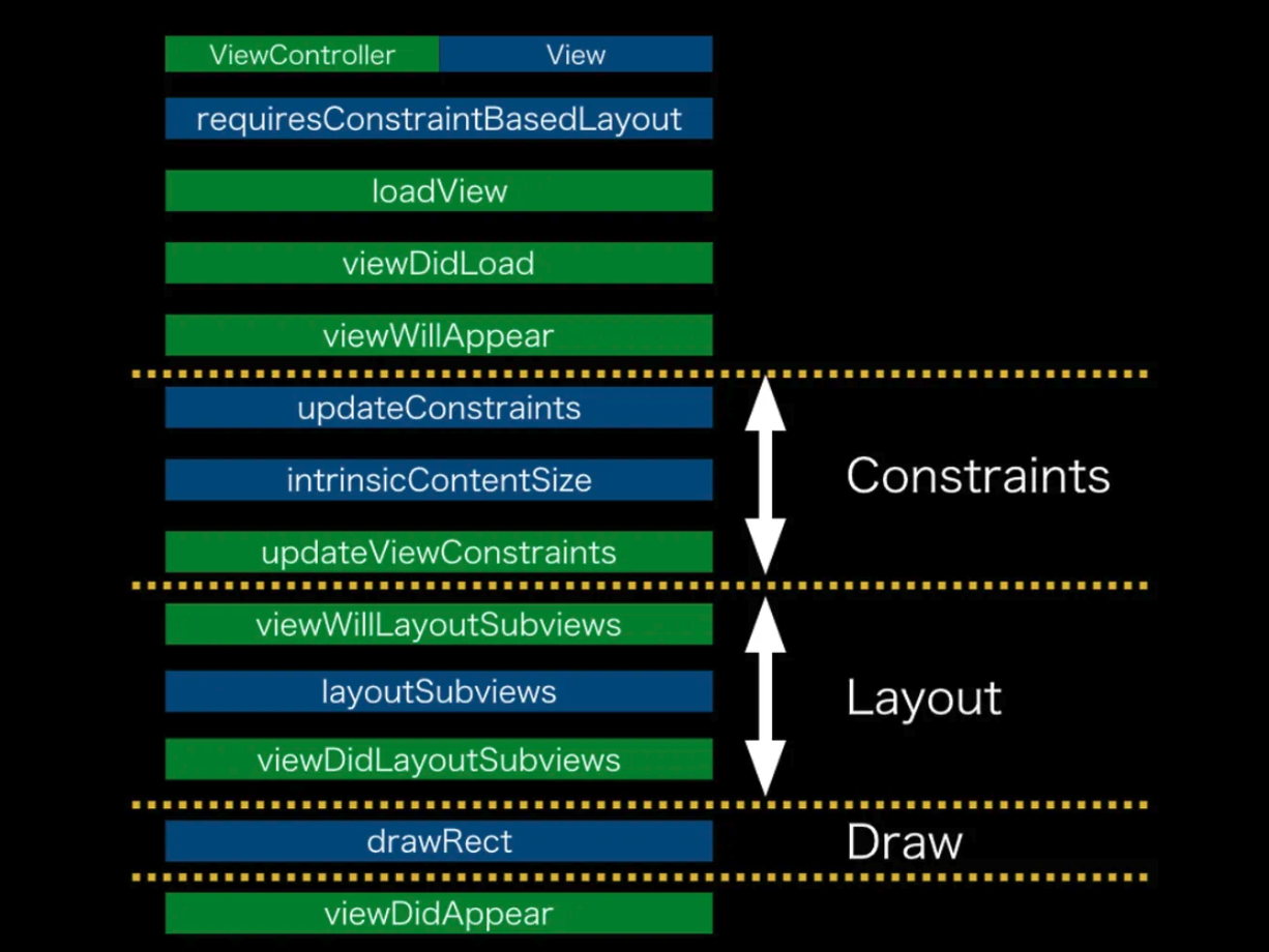 아래 그림은 ViewController의 라이프사이클과 UIView 가 그려지는 순서입니다. 위에서 설명한 constraint -> layout -> display phase 순서대로 진행되는걸 볼 수 있습니다.
