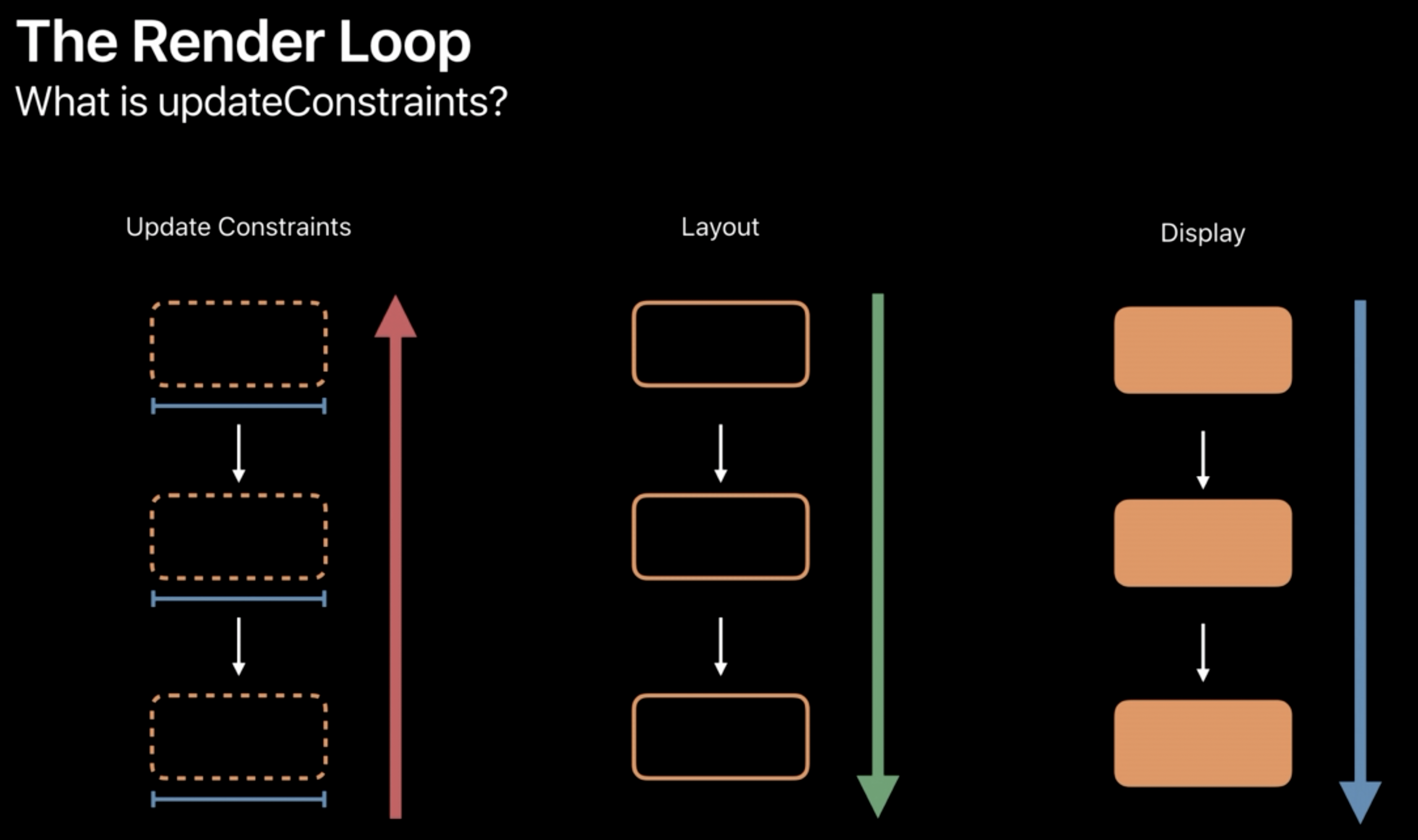 update Constraint는 가장 위에 있는 서브뷰부터 계산되고, layout은 베이스뷰부터 계산된다. display 도 우리 눈에 보이듯이 베이스뷰부터 그려지게 된다.