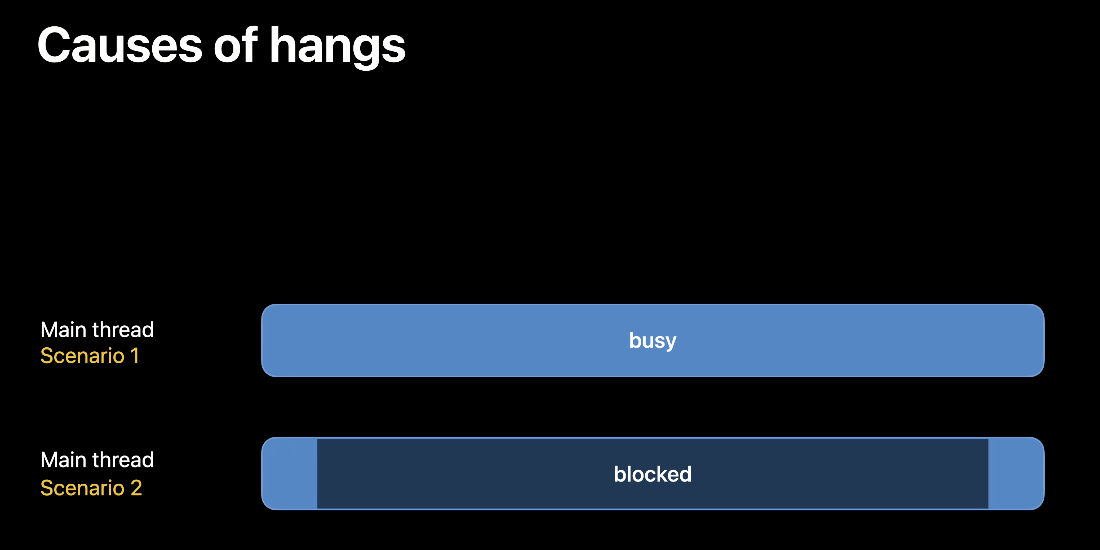 Hang은 2가지 시나리오로 발생할 수 있는데, 메인스레드가 너무 많은 작업을 수행하는 경우와 단일 긴 작업으로 인해 블로킹되는 경우입니다.