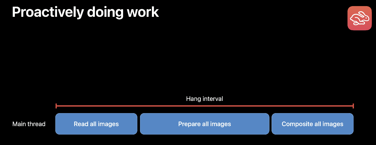 예를 들어 화면에 보여지는 이미지는 4개지만, 전체 이미지를 준비하려고 할 경우 아래와 같이 메인스레드가 불필요하게 너무 많은 작업을 수행하게 되고 Hang으로 이어집니다.