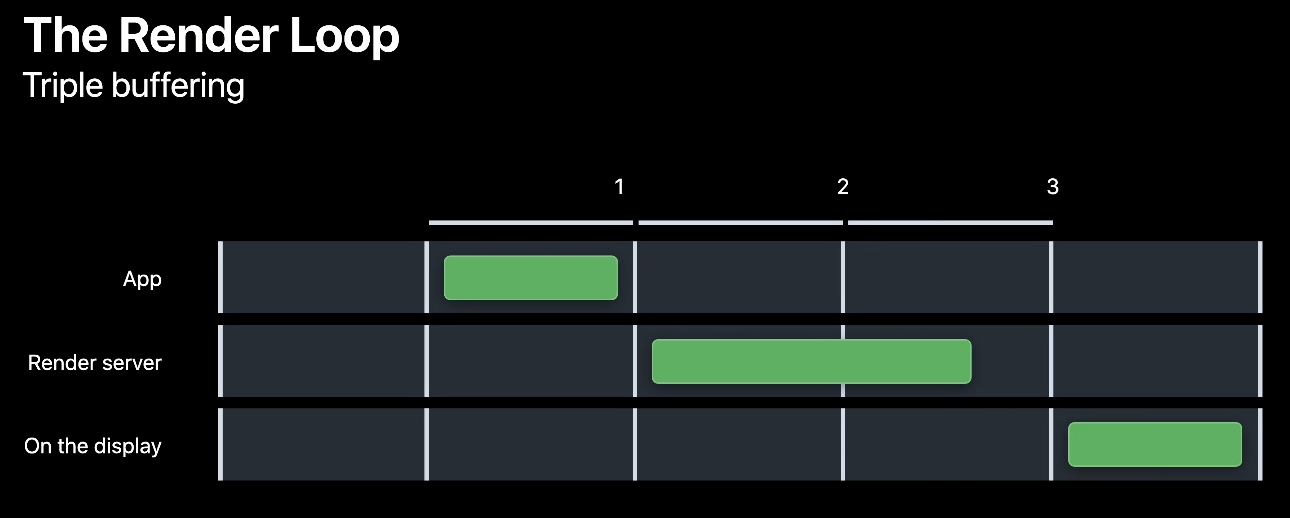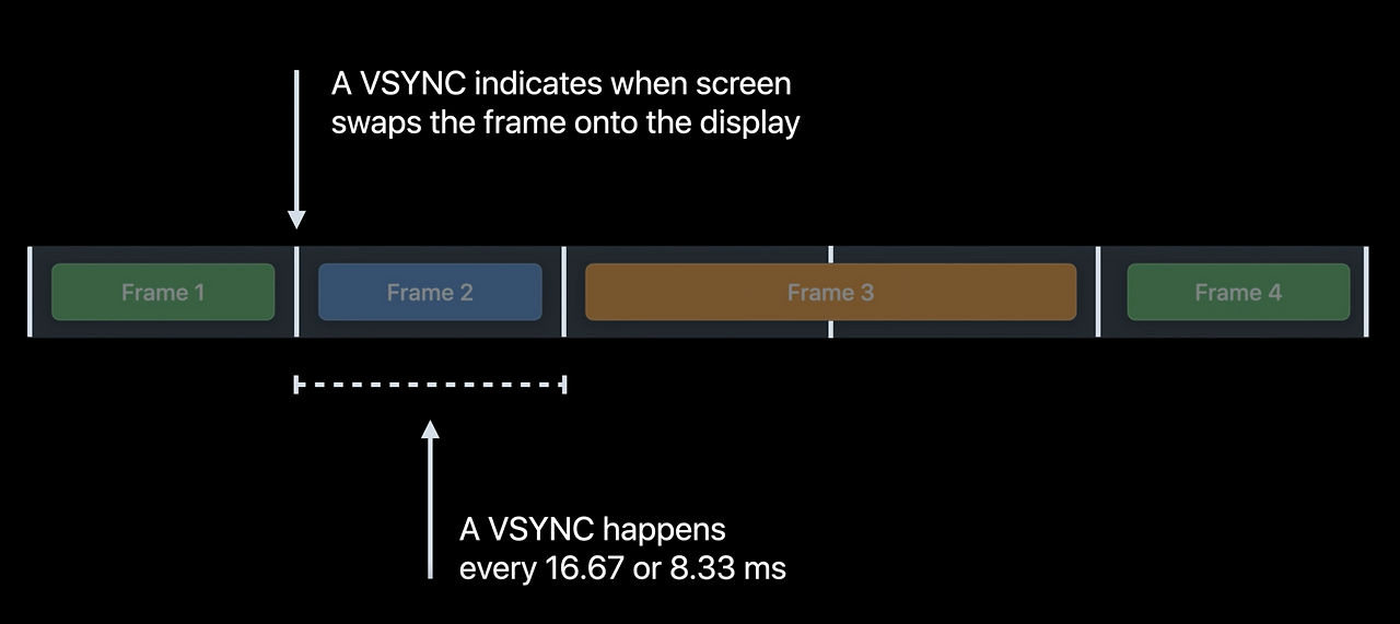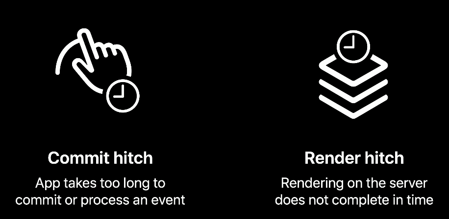 Hitch는 렌더 루프(Render Loop)에서 각 프레임의 생성이 마감 시간(VSYNC) 내에 완료되지 못했을 때 발생합니다.구형 아이폰이나 아이패드와 같이 60fps의 주사율을 가진 기기는 매 프레임이 16.67 ms 마다 보여지고, 120fps의 주사율을 가진 최신 기기들은 8.8.3 ms 마다 보여지게 됩니다. 이 시간이 조금만 넘겨도 프레임이 누락되며 스크롤이나 애니메이션이 끊기는 현상이 발생합니다.