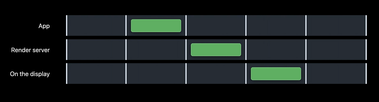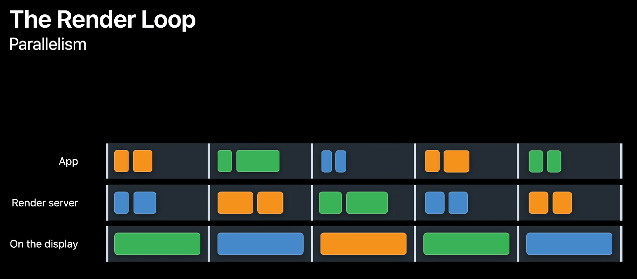 실제 프로세스는 평균 프레임 률을 높이기 위해 각 렌더 루프 스테이지를 병렬적으로 실행합니다. 앱 스테이지, 렌더 서버 스테이지, 디스플레이 스테이지를 동시에 수행하며 프레임을 병렬적으로 준비합니다.