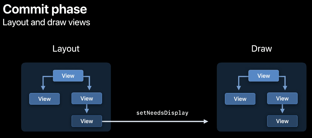 Layout이 필요한 뷰들을 부모에서 자식 순으로 배치하여 Layer Tree를 생성합니다. 그 다음 drawRect를 override한 커스텀 View나 setNeedsDisplay가 호출된 View들이 그려집니다. 모두 그려지게 되면 Layer Tree를 렌더링 하기 위해 렌더 서버로 제출합니다.