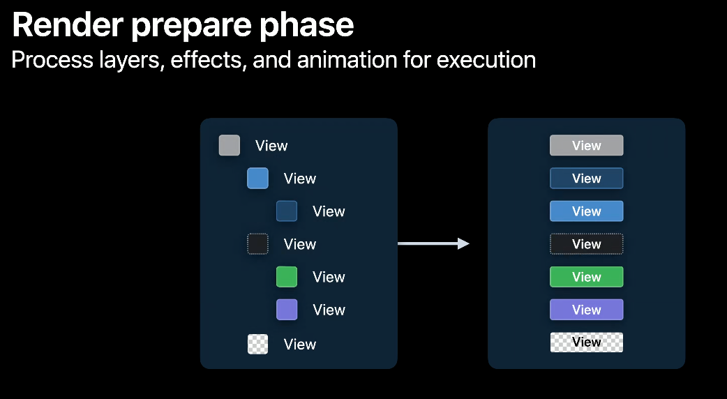 렌더 준비 단계는 모든 Layer Tree를 순회하여 GPU가 실행할 수 있는 선형 파이프라인을 준비합니다. 파이프라인은 부모 뷰에서 자식 뷰 순으로 뒤 -> 앞으로 배치됩니다.